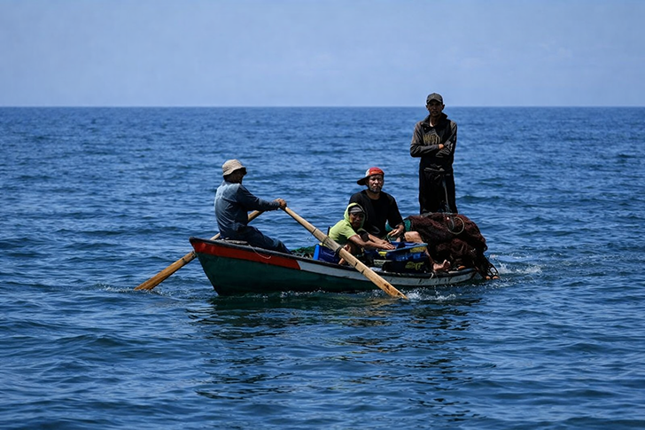 Di pelabuhan Khan Younis, Jalur Gaza, dua nelayan Palestina terlihat mengayuh perahu kecil yang sudah rusak sekitar 200 meter dari pantai. Sementara itu, di tepi laut, Dawood Sehwail, nelayan berusia 72 tahun, berdiri memperbaiki jaring yang robek sambil menatap ombak.