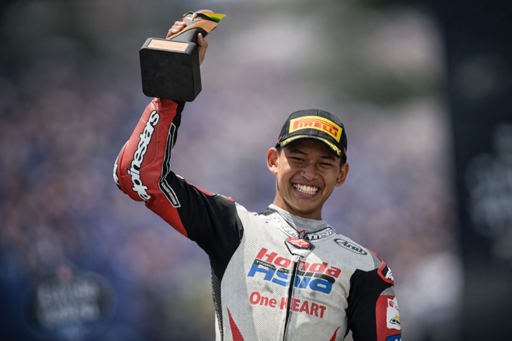 “Syukur alhamdulillah, tentunya saya sangat bangga dan juga senang karena di balapan kedua di GP ini saya bisa mendapatkan posisi ketiga,” ujarnya.