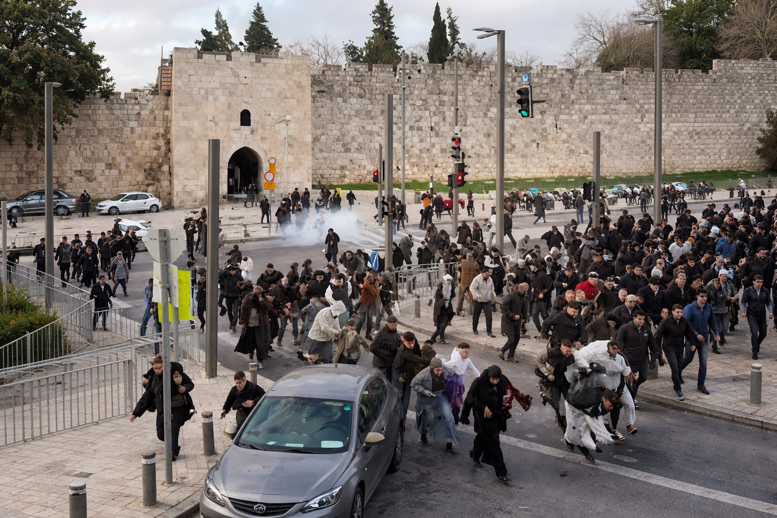Warga Palestina tampak berlari berhamburan untuk menghindari ledakan granat, sementara sebagian lainnya mencoba mencari perlindungan di sekitar tembok Kota Tua Yerusalem.