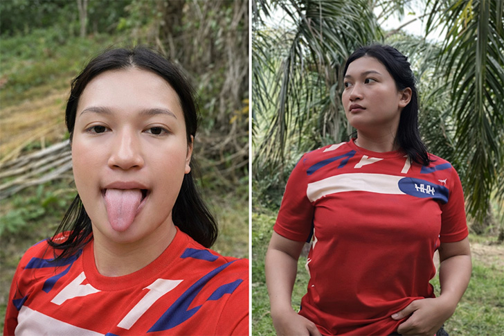 Perempuan tersebut memakai pakaian dominan merah. Di belakangnya terlihat remaja laki-laki yang diduga sebagai anak tirinya. Keduanya menyusuri kebun sawit yang luas dan sepi.